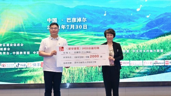 百千萬音樂人才培養工程副理事長趙海楠,代表組委會向著名音樂教育家、作曲家谷建芬發送“百千萬音樂人才培養工程總顧問”聘書,并接受谷建芬個人向百千萬音樂人才培養工程捐贈2000冊《谷建芬·新學堂歌》書籍。