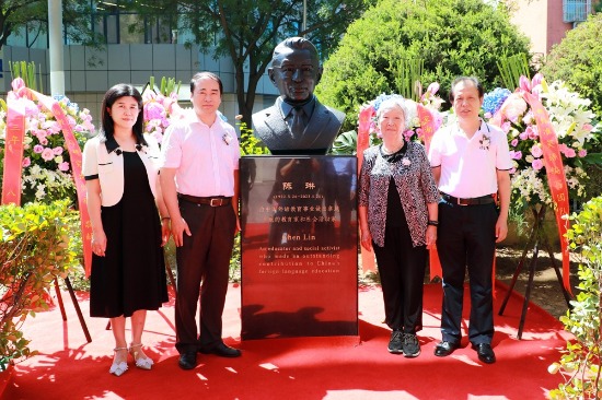 8月18日,為中國(guó)外語(yǔ)教育做出卓越貢獻(xiàn)的教育家和社會(huì)活動(dòng)家陳琳教授雕塑落成儀式在外研社舉行。北京外國(guó)語(yǔ)大學(xué)黨委書(shū)記王定華,黨委常委、副校長(zhǎng)孫有中,黨委常委、副校長(zhǎng)丁浩,外研集團(tuán)黨委書(shū)記、董事長(zhǎng),外研社社長(zhǎng)王芳,新中國(guó)英語(yǔ)教學(xué)的拓荒人、北京外國(guó)語(yǔ)大學(xué)終身榮譽(yù)教授伊莎白?柯魯克,外研社名譽(yù)社長(zhǎng)李朋義,陳琳教授家屬,《英語(yǔ)》(新標(biāo)準(zhǔn))編寫(xiě)團(tuán)隊(duì)以及外研社干部員工代表共同見(jiàn)證了雕塑揭幕。
