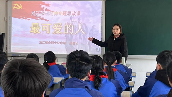 在現場授課環節,浙江革命烈士紀念館講解員張漫兮以“最可愛的人”為主題,結合圖片史料和音視頻資料,生動地為學生們講述了楊根思、黃繼光、邱少云等20余名志愿軍英烈的故事,以及壽志高、金耳世等浙江籍志愿軍英烈的光輝事跡。