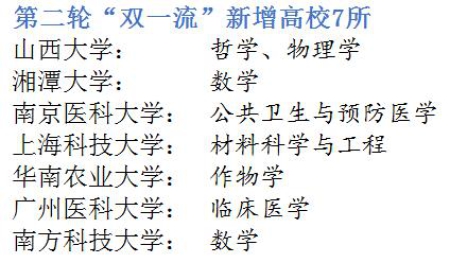 中國教育報-中國教育新聞網(wǎng)北京2月14日訊(記者 唐琪)記者今天從教育部獲悉,第二輪“雙一流”建設(shè)高校及建設(shè)學(xué)科名單公布,共有建設(shè)高校147所。其中,山西大學(xué)、湘潭大學(xué)、南京醫(yī)科大學(xué)、上海科技大學(xué)、華南農(nóng)業(yè)大學(xué)、廣州醫(yī)科大學(xué)、南方科技大學(xué)等7所高校的8個專業(yè)新增入選第二輪“雙一流”建設(shè)高校及建設(shè)學(xué)科名單。