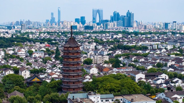 城門排列、街巷縱橫、水道交錯,歷經歲月滄桑,如今的姑蘇古城與《平江圖》里的整體布局基本一致。一頭是古城最高點,始建于南朝梁時的北寺塔,另一頭是蘇州工業園區拔地而起的摩天大樓,二者穿越時空、遙相呼應。