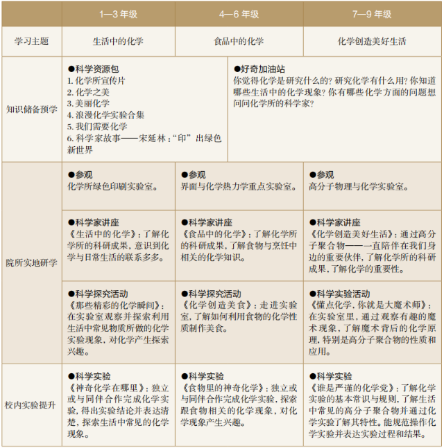 課程是科研院所科技資源與學校科學教育有效銜接、有機融合的核心。學區與科研院所組織開展中小學科學教師調研訪談,讓科學家了解學校科學教育的課程教學狀況、學生認知水平和發展需求,充分利用科研院所的科學家資源、實驗室資源、大科學裝置、博物館及展廳、最新科研成果等,整體設計學習主題、課程模塊和活動環節。課程設計充分尊重中小學生認知規律,體現學生發展核心素養要求,按照1-3年級、4-6年級、7-9年級不同學段,科學設計“知識儲備預學”“院所實地研學”“校內實驗提升”等課程模塊。