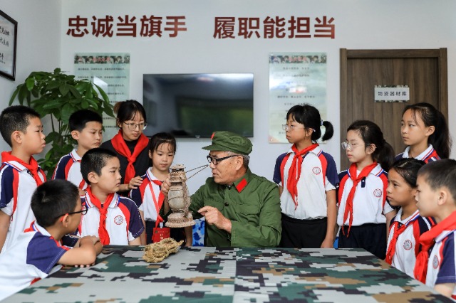 近日,浙江省湖州市長(zhǎng)興縣呂山小學(xué)在呂山村老兵驛站聆聽退役老兵講紅色故事。周洪峰 攝