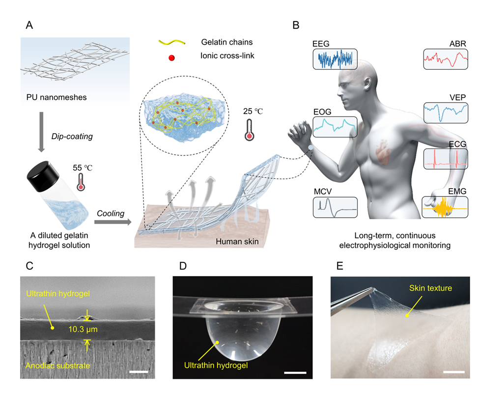 該研究包括兩個關(guān)鍵步驟:首先,設(shè)計明膠熱敏相變水凝膠材料;其次,通過納米網(wǎng)格增強(qiáng)結(jié)構(gòu)實現(xiàn)超薄韌特性。由此得到水凝膠皮膚電極厚度低至10微米,并表現(xiàn)出優(yōu)異機(jī)械魯棒性、皮膚粘附性、透氣性和抗失水性能。為了展現(xiàn)其在疾病早期發(fā)現(xiàn)及治療方面的應(yīng)用,課題組展示了在日常穿戴條件下該水凝膠電極對人體心電圖、肌電圖、運動傳導(dǎo)速度、眼電圖、腦電圖、聽覺腦干反應(yīng)、視覺誘發(fā)電位等信號的高保真長期連續(xù)監(jiān)測。