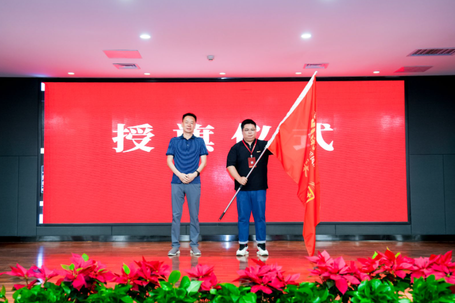 河南日?qǐng)?bào)社黨委委員、副總編輯王珂(左)為媒體代表授旗