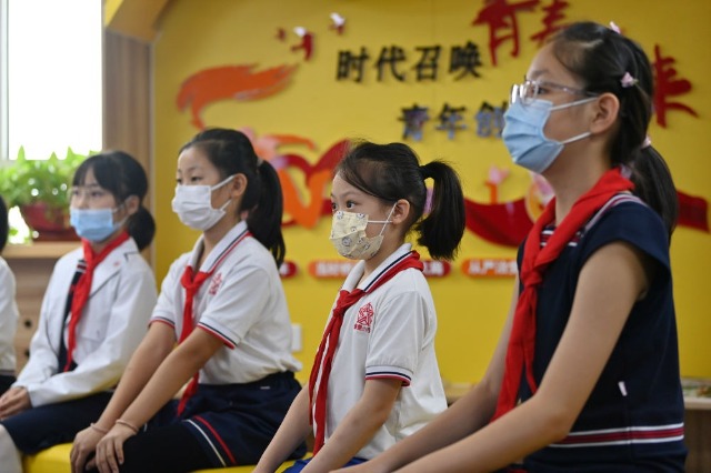 天津市和平區(qū)新星小學(xué)學(xué)生在觀看電影《我和我的祖國》(2021年9月28日攝)。新華社記者 李然 攝