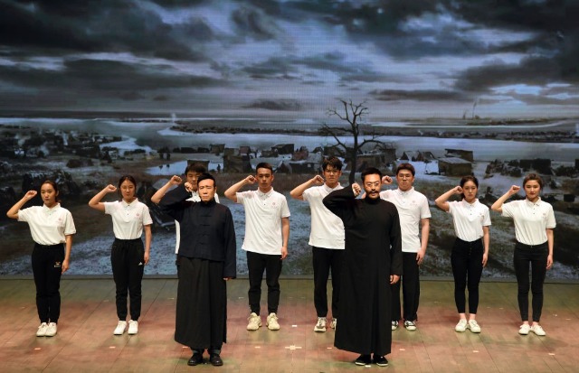 電視劇《覺醒年代》主創(chuàng)團(tuán)隊(duì)走進(jìn)北京大學(xué),劇中主要演員與北大學(xué)生同臺演出(2021年4月20日攝)。新華社記者 任超 攝