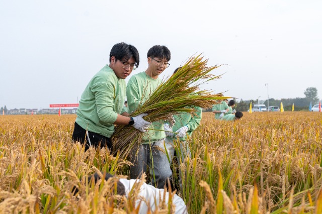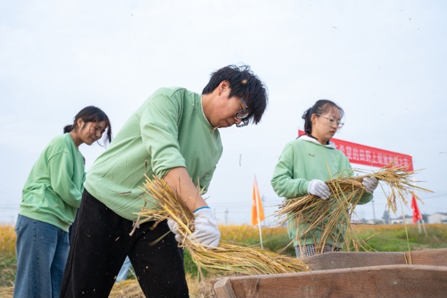 54名青年學(xué)子組成9支隊(duì)伍,在金色的稻田里展開了一場激烈的水稻收割比拼。比賽分為“收割”和“脫粒”兩個環(huán)節(jié),既考驗(yàn)隊(duì)員們使用傳統(tǒng)農(nóng)具的熟練程度和團(tuán)隊(duì)協(xié)作的默契度,也檢驗(yàn)他們對“顆粒歸倉”這一勞動品質(zhì)的理解與踐行。經(jīng)過緊張激烈的角逐,“稻滿爭先”隊(duì)?wèi){借“零割漏,快準(zhǔn)狠”的精湛技藝脫穎而出,勇奪冠軍。