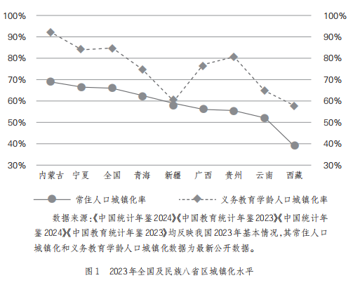 義務教育學齡人口城鎮化水平高于常住人口城鎮化水平,教育城鎮化的省際差異顯著。總體來看,義務教育學齡人口城鎮化水平高于常住人口城鎮化水平,均呈增長趨勢。2023年,八省區總體義務教育學齡人口城鎮化率為73.86%,較常住人口城鎮化率高16.07個百分點。民族地區教育城鎮化水平低于全國,2023年,八省區總體義務教育學齡人口城鎮化水平較全國平均水平低11.13個百分點,表明民族地區對鄉村義務教育學位的需求相對較大。分省份看,教育城鎮化水平的區域差異顯著。比如,與全國平均水平相比,內蒙古、寧夏呈現常住人口與學齡人口城鎮化“雙高”特點,西藏、云南呈現“雙低”特征;貴州學齡人口城鎮化水平遠高于常住人口城鎮化水平,新疆學齡人口城鎮化水平僅略高于常住人口城鎮化水平。義務教育學齡人口城鎮化水平高于常住人口城鎮化水平的程度,體現了城鄉教育質量的差異和人們對優質教育的追求程度,各地需根據城鄉學齡人口的分布和發展趨勢,優化教育資源配置。