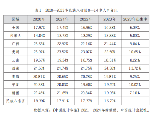 本文以民族人口比例高的八省區(內蒙古、寧夏、新疆、西藏、廣西、貴州、云南、青海)為例,分析區域人口變化對教育資源配置的影響。總體來看,“十四五”期間,民族八省區人口規模保持在2億左右,占全國人口比例基本穩定在14.3%左右。人口出生、流動特征及變動趨勢對義務教育學位需求產生相應的影響。
