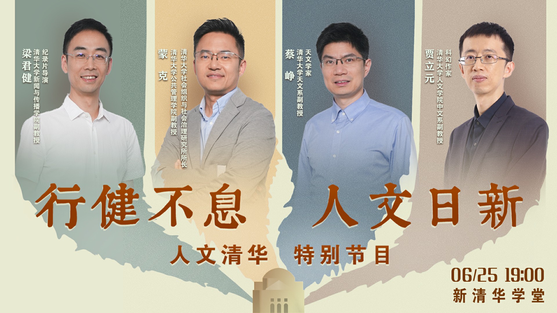 6月25日晚7點,“人文清華”講壇特別節目——行健不息·人文日新,4位清華80后行動派學者,蔡崢、梁君健、賈立元、蒙克帶領你認識天文學、新聞傳播學、文學和公共管理學,從不同緯度思考理想與人生。