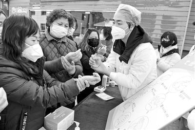 1月6日,在江蘇省鎮(zhèn)江市新金江社區(qū),江蘇大學醫(yī)學院志愿者在指導居民學習“七步洗手法”。江蘇大學醫(yī)學院志愿者來到鎮(zhèn)江市和平路街道新金江社區(qū),開展“疫情防控知識伴我行”活動,向中老年居民普及新的疫情防控優(yōu)化條例,宣講日常的健康防疫知識及防護技能,增強市民的健康防護意識。石玉成 攝