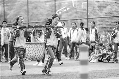 4月26日,在浙江省湖州市德清縣實驗學校,學生們正在進行運籮筐比賽。當天,該校舉行農耕文化運動會,通過挑扁擔、運籮筐、拔河等趣味項目比賽,讓學生體驗農耕傳統文化的同時暢享體育運動帶來的快樂。王樹成 攝
