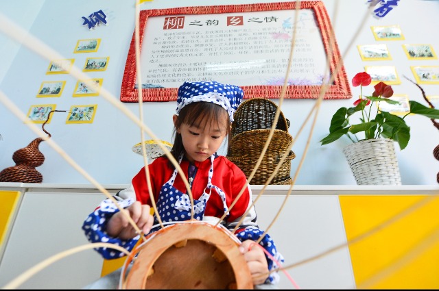 近日,在山東省臨沂市臨沭縣第五實(shí)驗(yàn)小學(xué)開展的“學(xué)柳藝 傳非遺”主題教育活動(dòng)上,一名學(xué)生在編制柳筐。近期,該校開展“學(xué)柳藝 傳非遺”主題教育活動(dòng),孩子們?cè)诮處煹闹笇?dǎo)下,學(xué)習(xí)掌握柳編技巧,傳承弘揚(yáng)中華優(yōu)秀傳統(tǒng)文化。王海濱 攝