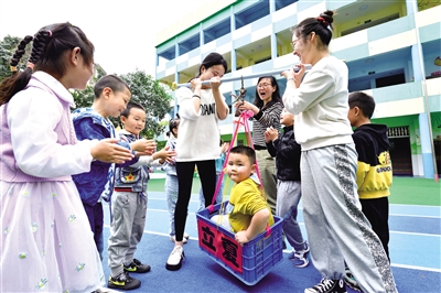 5月5日,湖北省襄陽市保康縣縣直機(jī)關(guān)幼兒園教師用傳統(tǒng)方法給孩子稱體重。立夏將至,該幼兒園開展繪彩蛋、稱體重等活動,讓孩子們感受立夏傳統(tǒng)民俗。楊韜 黃丹 攝