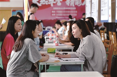 5月19日,在中南林業(yè)科技大學(xué)涉外學(xué)院,應(yīng)屆畢業(yè)生與招聘人員(右)交流。當(dāng)日,湖南省長沙市望城區(qū)2023屆高校畢業(yè)生就業(yè)服務(wù)季啟動(dòng)式暨中南林業(yè)科技大學(xué)涉外學(xué)院專場招聘會(huì)舉行。涵蓋智能終端、新材料先進(jìn)制造、食品醫(yī)藥、移動(dòng)互聯(lián)網(wǎng)等領(lǐng)域的171家企業(yè),為畢業(yè)生提供5000多個(gè)崗位。