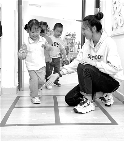 活動在幼兒來園、離園、散步回班等時間開展,靈活方便,容易實施,針對性強。隨著幼兒跳躍能力的提升,教師還可以進行適度調整以加大難度,如調整格子的大小,采用更加復雜的密碼等。剛開始,教師給了幼兒兩個數字,如1、3,隨著幼兒能力的增強,開門密碼逐漸增加到4個,如2、4、6、3。幼兒都非常喜歡這樣的進門方式,每天離園之前總追問教師:“明天的開門密碼是什么?我要早點來破解!”