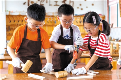 8月22日,在安徽省蕪湖市繁昌區城關幼兒園木工坊,暑托興趣班的孩子們使用各種木工工具分組開展創意木工活動。活動旨在培養孩子們形成專注、協助、自主、有序和探究的“工匠精神”。田園園 攝