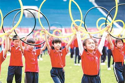 近日,湖北省襄陽市人民路小學學生正在進行呼啦圈運動展示。該校1000多名學生在襄陽市體育場進行了“千人呼啦圈”大課間體育匯報展演,慶祝亞運會舉辦。聶志鵬 攝
