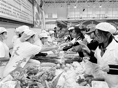 近日,廈門市蔡塘學校學生正在“買菜”。該校舉辦第三屆“食悅杯”家務勞動技能大賽,以班級為單位,設置兩葷一素自選菜烹飪、家鄉特色小吃烹飪和跟著主廚現場學藝、洗洗涮涮4個環節,檢閱并培養學生的勞動技能。學校供圖