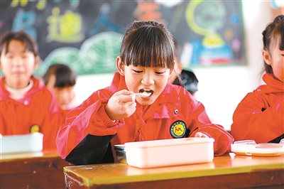 12月6日,貴州省黔西市五里布依族苗族鄉(xiāng)荒田村軍民小學三年級學生正在享用免費營養(yǎng)午餐。近年來,當?shù)爻掷m(xù)推進農(nóng)村學生營養(yǎng)午餐關(guān)愛工程,確保學生吃得飽、吃得好。周訓超 攝