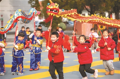 近日,江蘇海安高新區海北幼兒園的孩子們在學習舞龍。近年來,該幼兒園深入推進“一校一品”建設,邀請“丁家龍”傳人指導孩子們學習舞龍技藝,讓孩子們在運動中感受中華優秀傳統文化的魅力。 翟慧勇 攝
