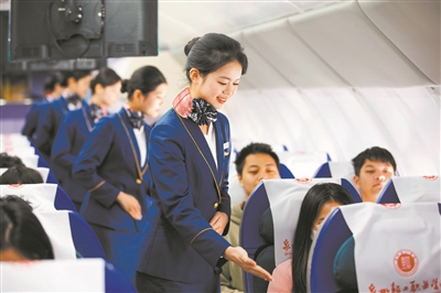近日,在泉州輕工職業學院新配置的國產大飛機C919同款航空模擬機艙內,該校空中乘務專業學生正在進行安全提醒服務訓練。近年來,該校實行“訂單式”辦學,為各行業培育職業人才。謝貴明 攝