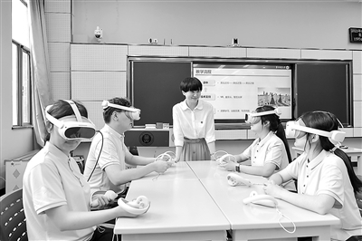 華中師范大學(xué)馬克思主義學(xué)院教師丁茜利用虛擬仿真設(shè)備為學(xué)生講授課程“人與自然是生命共同體”。 資料圖片