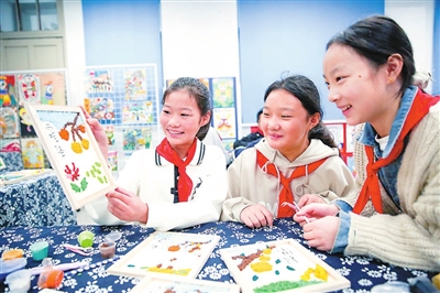 日前,在江蘇省如皋市東陳鎮丁北小學,學生們相互展示制作的霜降節氣非遺紙漿畫作品,感受傳統民俗節氣的獨特魅力,迎接霜降的到來。