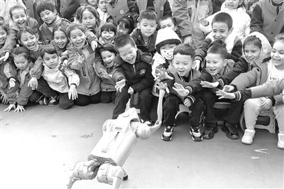 近日,新疆烏魯木齊市第一百二十小學學生與機器狗互動。當日,烏魯木齊市科技館科普小分隊走進該校,開展科普宣傳進校園系列活動,為學生們送上一堂生動有趣的“科技+實踐”科普課。 孫振嵩 攝