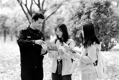 11月4日,在江蘇省宿遷學院,民警向大學生宣傳防范網絡購物詐騙知識,增強學生防詐意識和能力。王力 攝