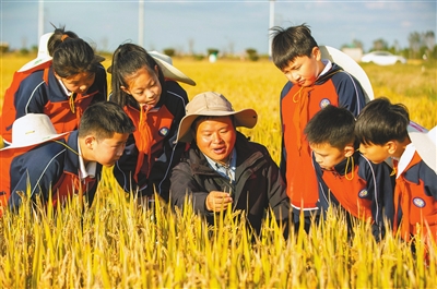 近日,江蘇省南通市通州區金沙小學組織學生來到校外田間,聽農業技術人員講解水稻種植知識,讓學生了解種糧的艱辛,培養學生熱愛勞動、愛惜糧食的美德。 翟慧勇 攝
