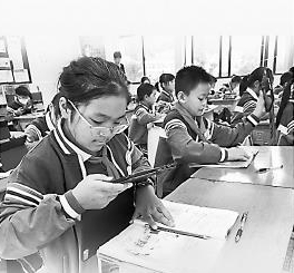 ①安徽省六安市金寨縣天堂寨同心小學學生使用平板電腦拍照上傳隨堂練習。