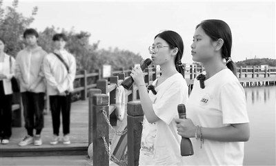 廣東海洋大學(xué)學(xué)生在紅樹林畔開展思政實(shí)踐。 資料圖片