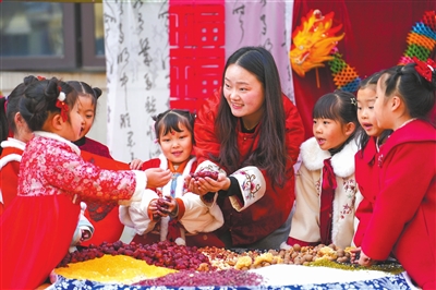 1月3日,浙江省湖州市德清縣武康街道千秋幼兒園開展“萌娃學(xué)民俗 開心迎臘八”活動(dòng),小朋友通過認(rèn)食材、做臘八粥、印福字等民俗活動(dòng),感受中華優(yōu)秀傳統(tǒng)文化的獨(dú)特魅力,迎接臘八的到來。 王正 攝