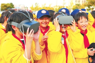 安徽省淮北市首府實驗小學學生在體驗科普大篷車VR。 萬善朝 攝