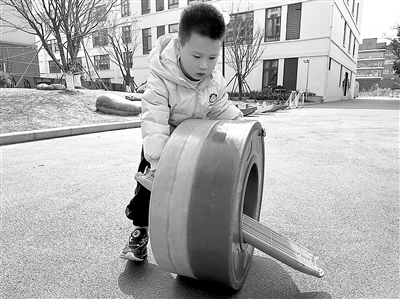 糖豆嘗試用一塊平衡板推動(dòng)大圓輪。周亞芳 攝