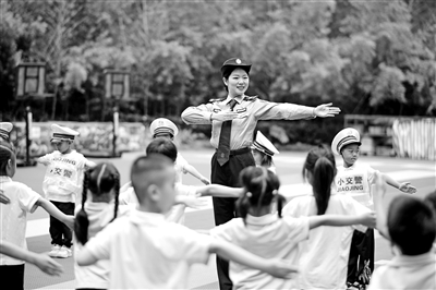 在盛世侗鄉幼兒園,干警在教小朋友交通手勢。
