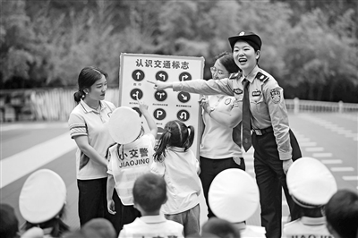 在盛世侗鄉幼兒園,干警在教小朋友認識交通標志。 李尚引 賀穎 攝