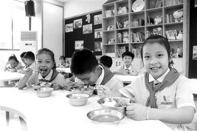 玉林市玉東新區實驗小學三年級學生在教室用中餐。玉林市教育局供圖
