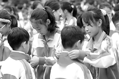①山東省高密市恒濤實驗小學少先隊老隊員為新隊員佩戴紅領巾。 通訊員 李海濤 攝