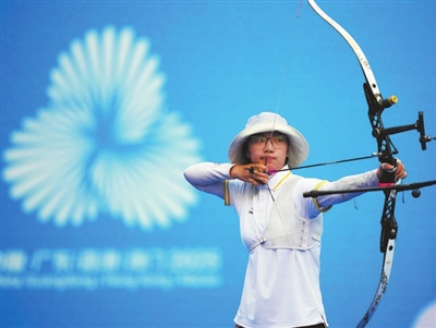 在射箭女子反曲弓個人決賽金牌決賽中,湖北小將宗鈺戰勝江蘇隊選手奪冠。