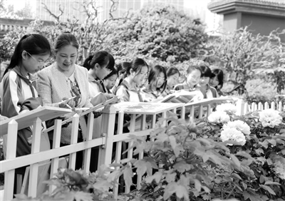 菏澤市牡丹區牡丹小學師生在當地牡丹園里寫生。